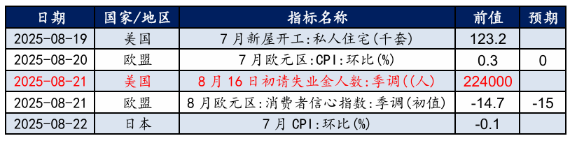 本周关注美联储主席鲍威尔的表态。8月21日至23日将于杰克逊霍尔举行全球央行行长年度会议,重点关注美联储主席鲍威尔周五在会上的讲话。继7月份意外疲软的就业报告和较温和的CPI数据之后,鲍威尔可能会为9月份的降息铺平道路。利率期货显示的年内降息预期仍然是3次,分别为9月、10月和12月,9月预期降息概率超九成。